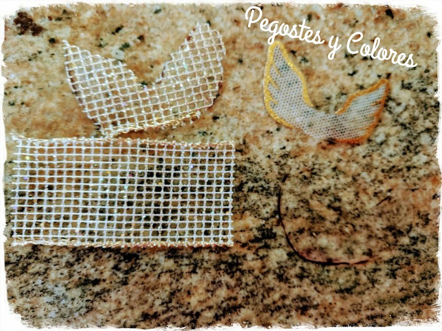3.- Para las alas corte mica de los empaques de las cajas de fresas o acetato y pegue encima con silicon un listón de arpilla con glitter y dorado que tenia. Luego pegue las alas en la espalda con mas silicona. La idea la tome imitando el ala de una de las originales que me regalo mi mama que pueden ver a la derecha en la foto.