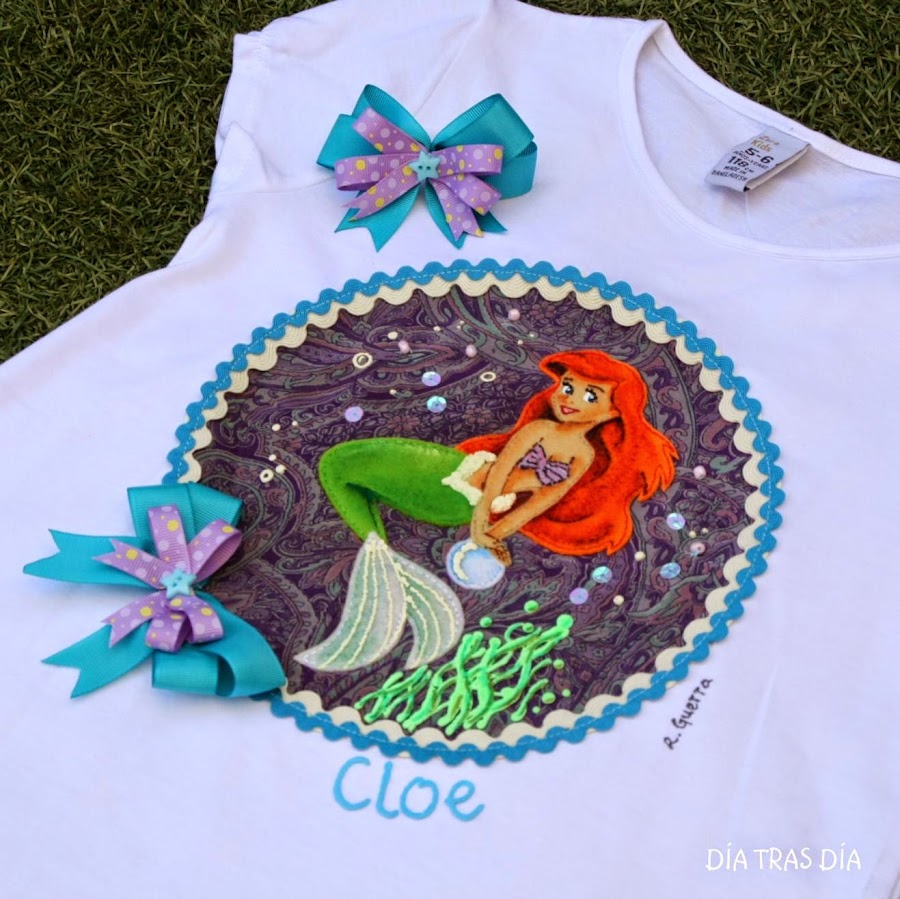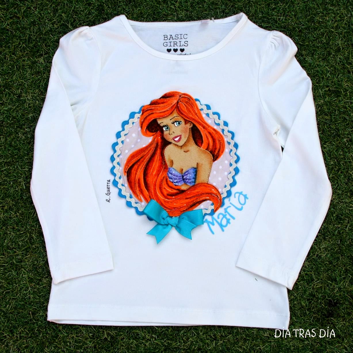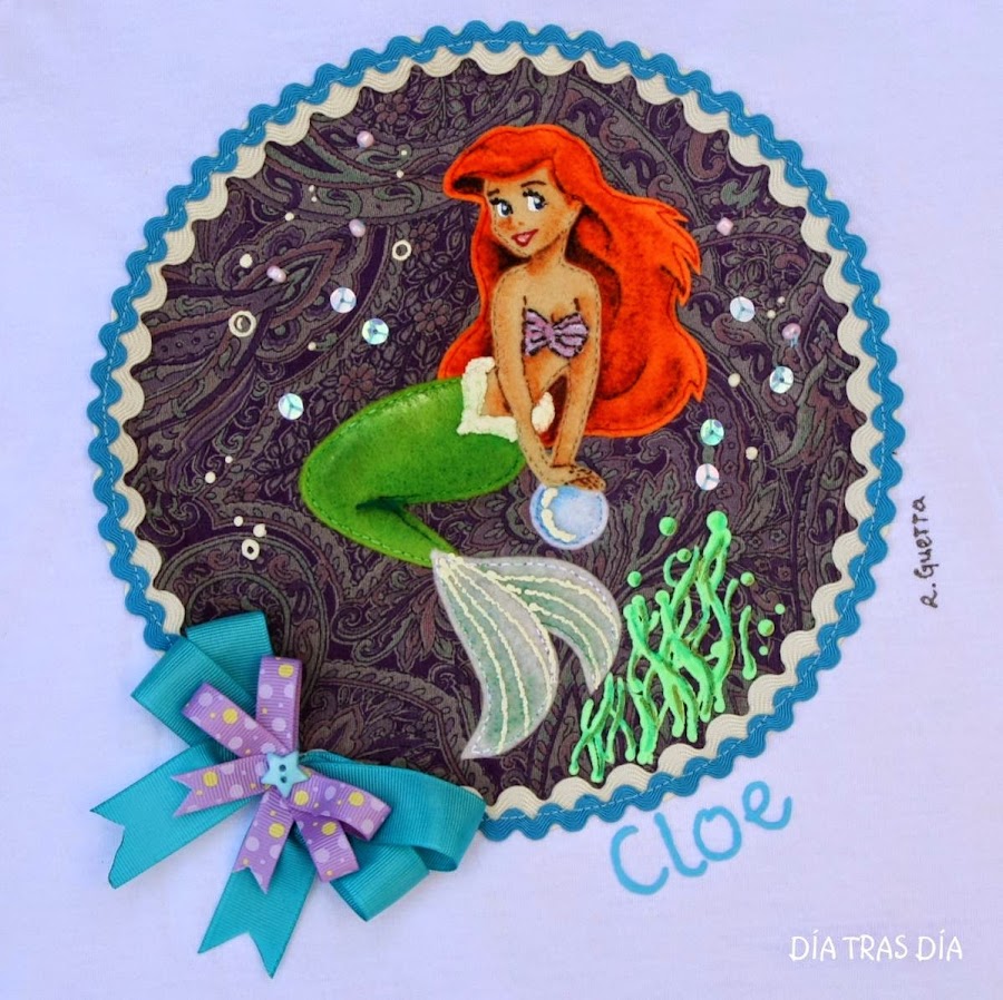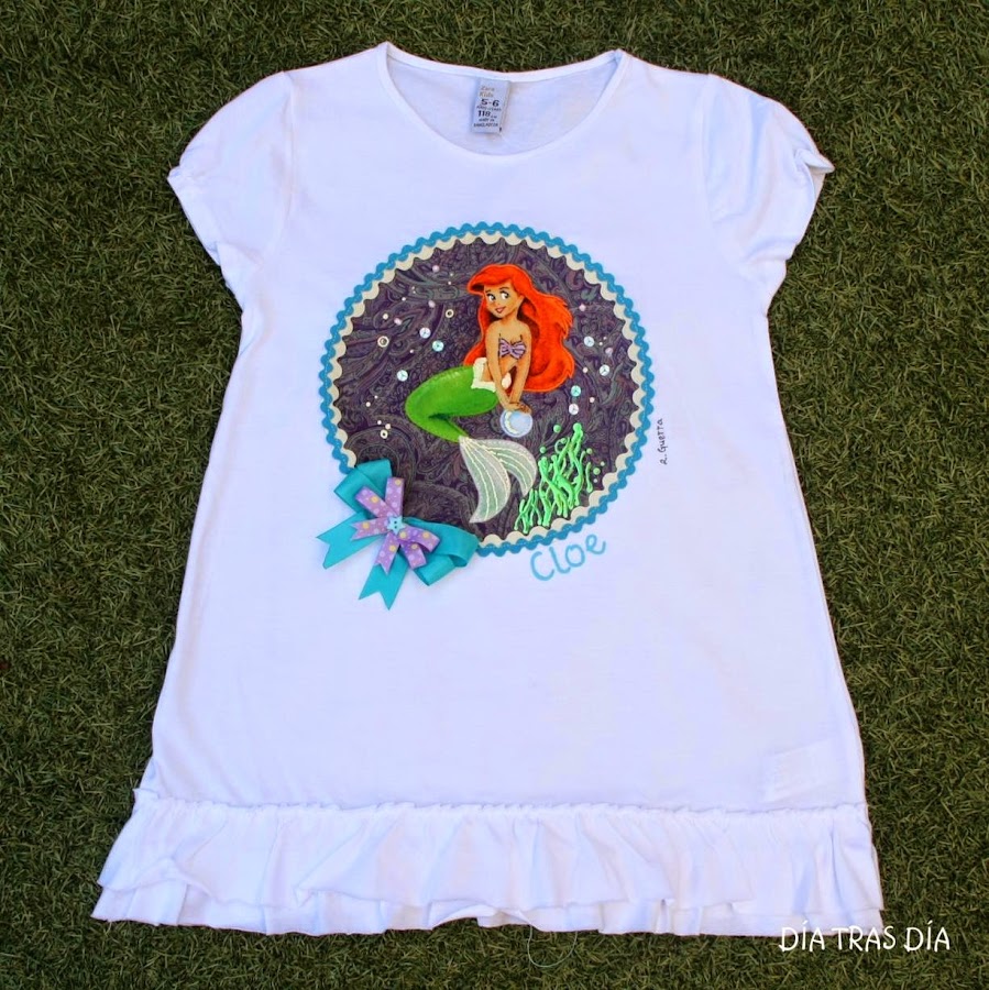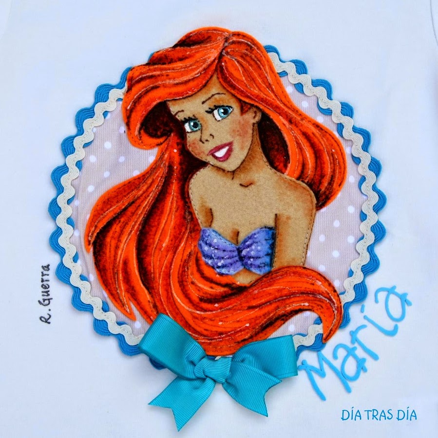 Se trata de la Sirenita, dibujo que ya había hecho en alguna otra ocasión, en distintas versiones. Aquí, por ejemplo, podéis ver cómo quedó una igual que la que traigo hoy, que formó parte de un pedido de camisetas con distintas princesas Disney.