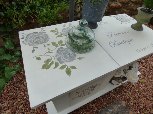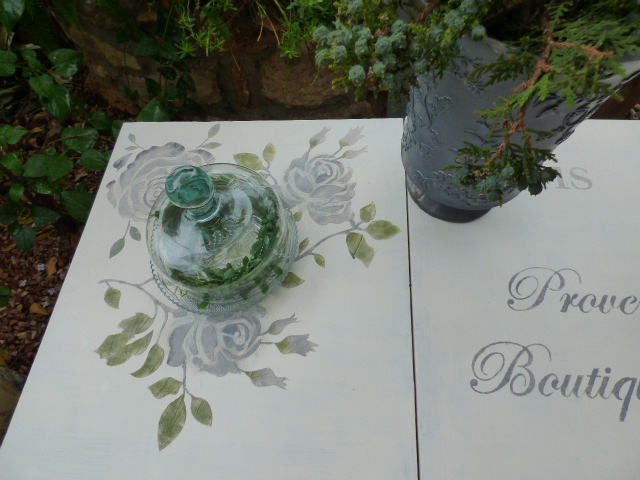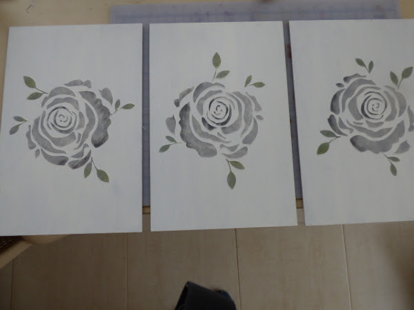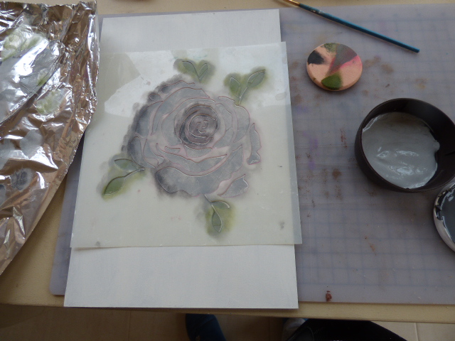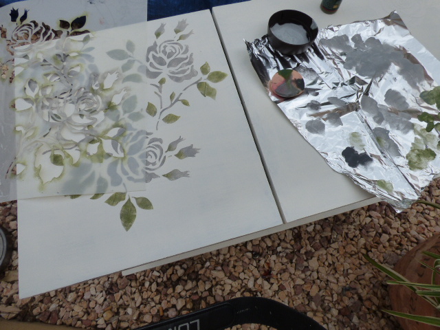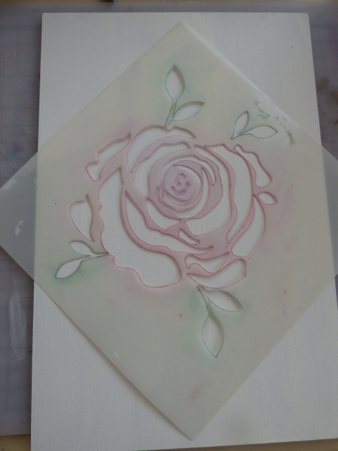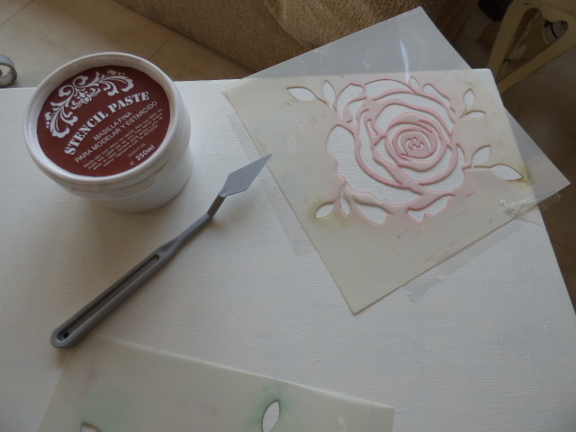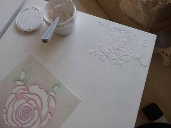 Con pasta de relieve y una plantilla de estarcido hice 2 rosas en relieve en la parte superior