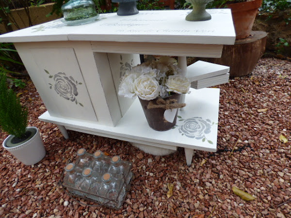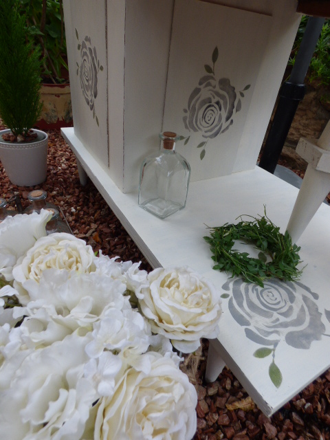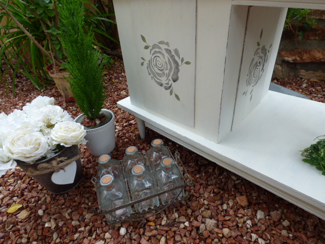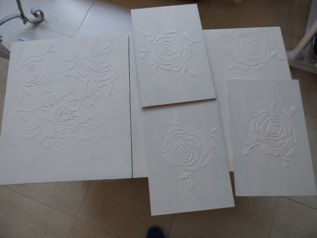 Siempre tengo en casa tablillas de estas de DM finito que venden en cualquier lado y pensé que lo mejor, era decorar esas tablillas y pegarlas sobre los dibujos, asi que las pinté del mismo blanco y les hice también relieves, con la misma rosa. Sólo 3, porque la trasera del mueble, vá a ir pegada a la pared.
