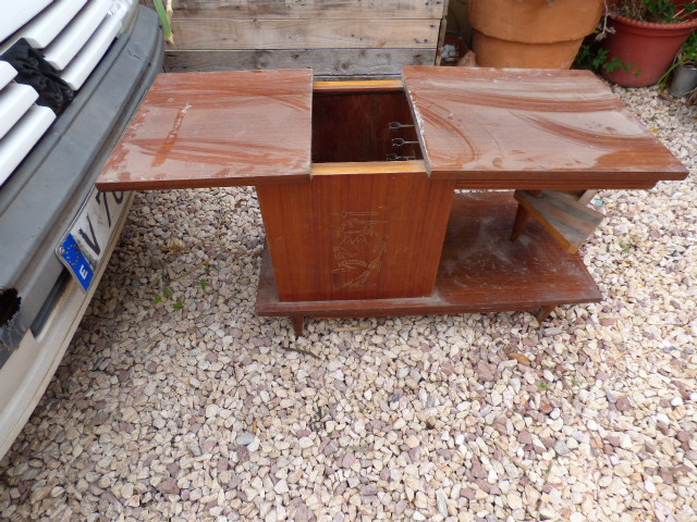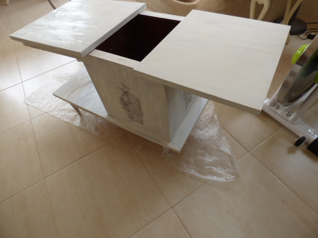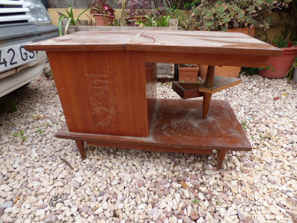 Como muchas de vosotras me dijisteis la semana pasada, esta mesita debió utilizarse como mueble bar. Los ganchos de dentro debían ser para colgar las copas.....gracias por la ayuda¡ La verdad es que ni se me había ocurrido¡
