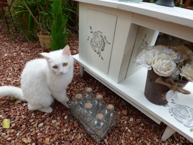 Ese contrachapado que tenía miedo me daba.....así que primero le dí una capa de imprimación todoterreno y después Chalky blanco puro. Fué entretenido pintarla, pero bueno, disfrutando, que es lo suyo...ahí tirada en el suelo tan a gusto.......