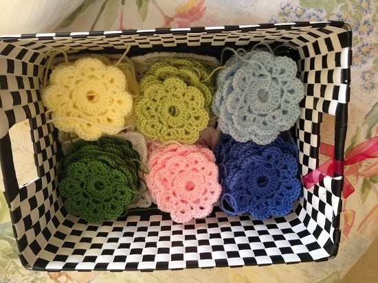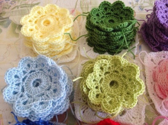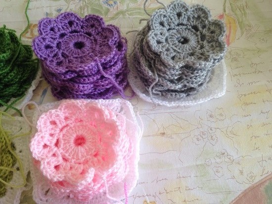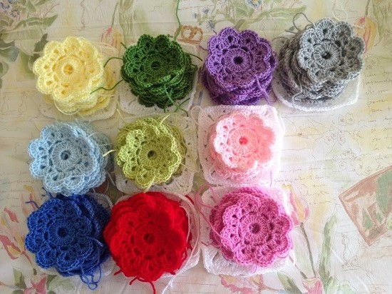 Si recordáis estoy utilizando trece colores con los que tenía que tejer 10 flores de cada color. De momento ya he terminado de tejer las flores de estos colores: amarillo claro, los dos tonos de verde, gris, los dos tonos de rosa y azul, lila, rojo y gris, ¿os gustan?
