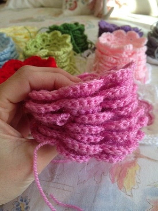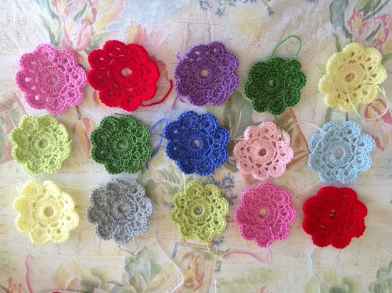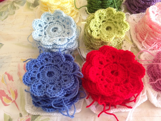 Haciendo cálculos, queda por hacer treinta flores más el borde blanco de cada una de ellas, porque son diez de cada color y tengo que deciros que se hacen bastante rápido