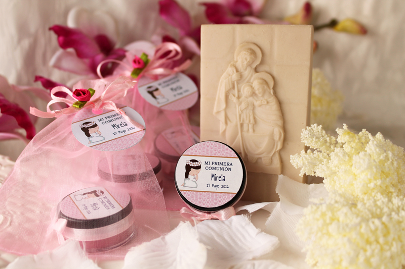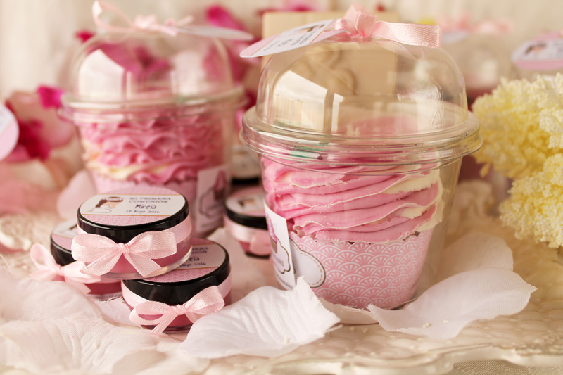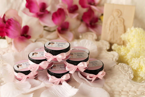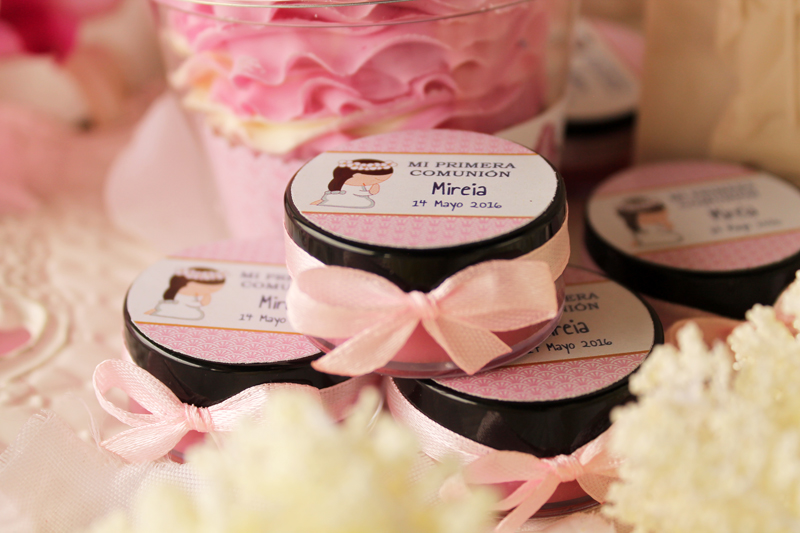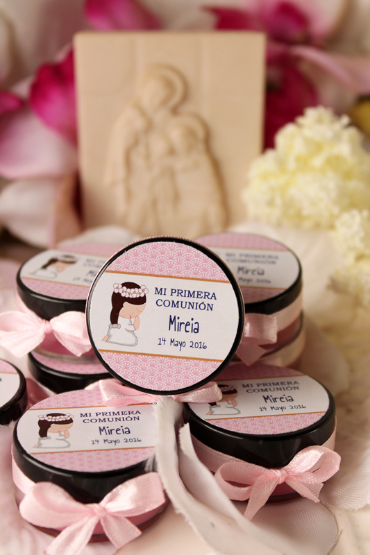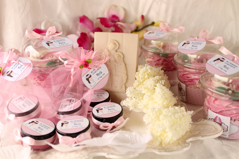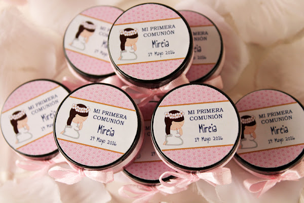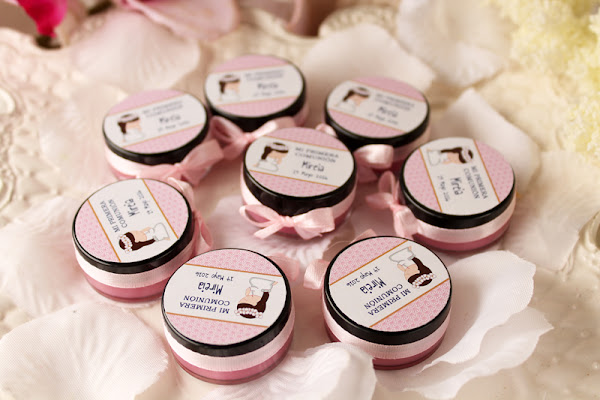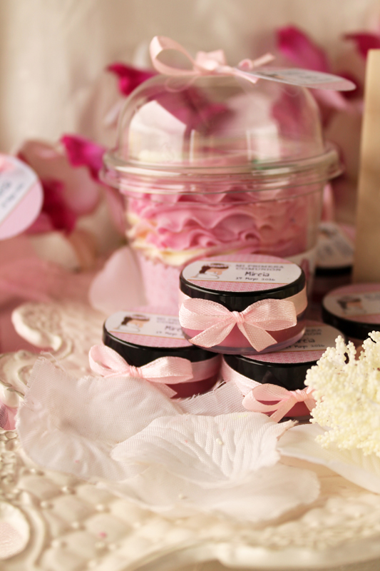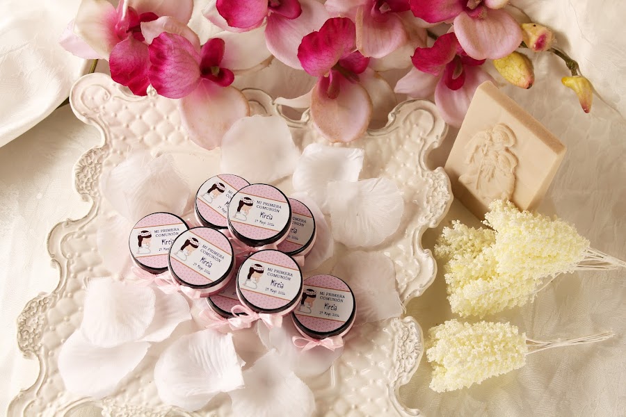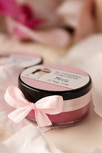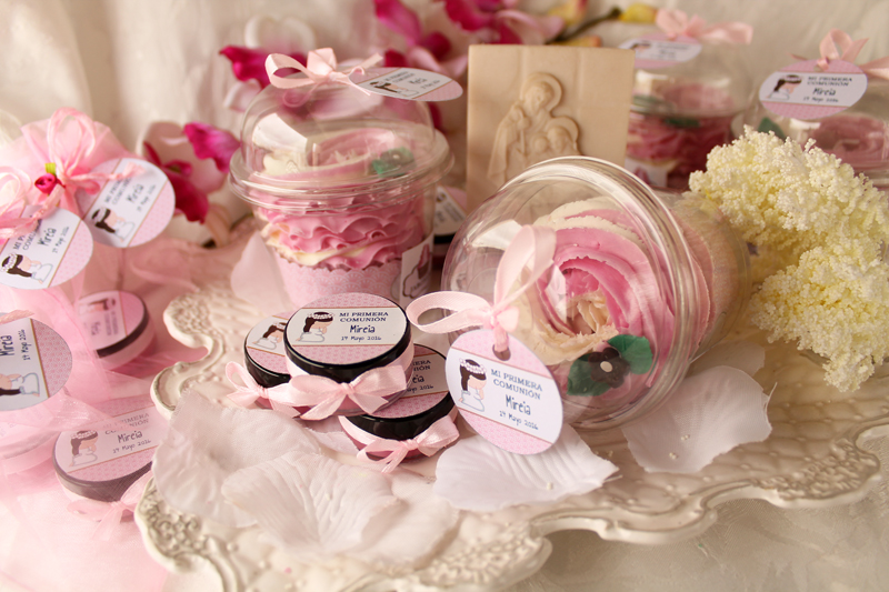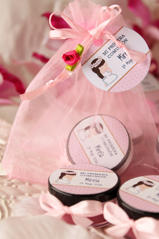 En esta ocasión para la comunión de Mireia nos solicitaron los balsamos labiales con bolsita de organza que como podeis ver les pusimos a juego la etiqueta de bálsamo, y como los detales los iban a repartir entre invitadas de diferentes edades nos pidieron también unos jabones cupcakes grandes en forma de flor en tonos rositas-mixtas, que personalizamos también a juego del bálsamo, y es que nos encanta que todo lleve una harmonia , etiquetas, bolsas de organza, lacitos, wrappers, ..
