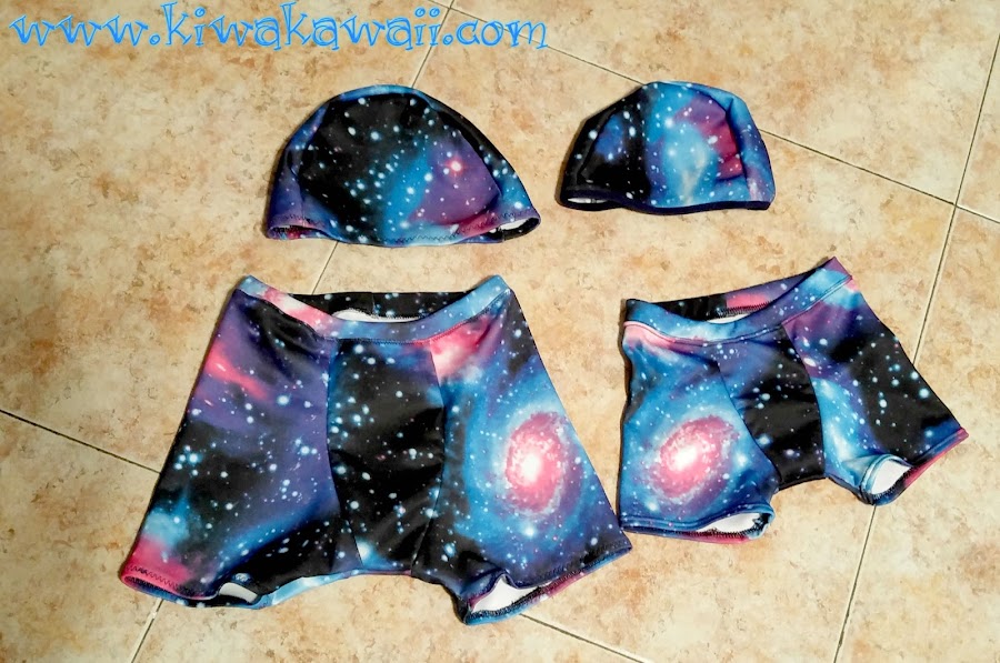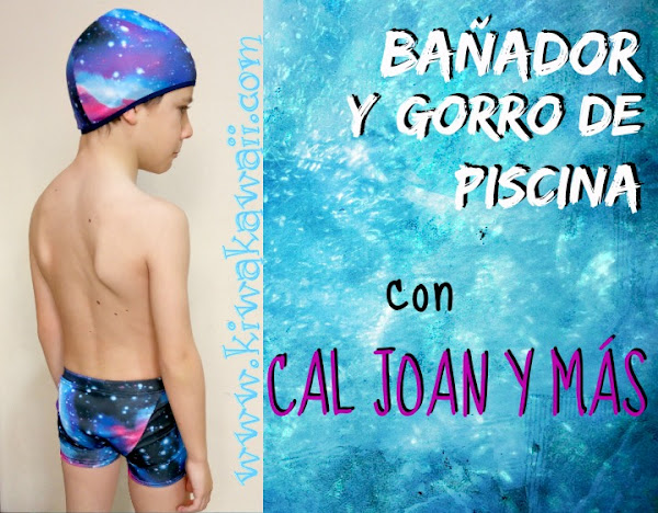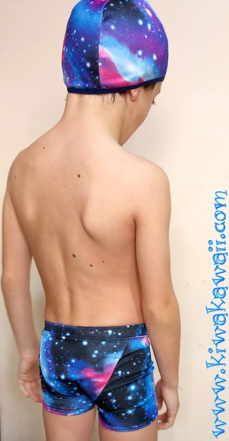 El patrón es de Naii, ya sabéis, de los que nunca fallan! Un patrón bueno y una tela buena son una mezcla genial, así que en un ratito teníamos las prendas listas. En el bañador añadí una etiqueta handmade para que sea fácil distinguir la parte delantera de la trasera. En el gorro pusimos un sello en la parte interior con el mismo fin.