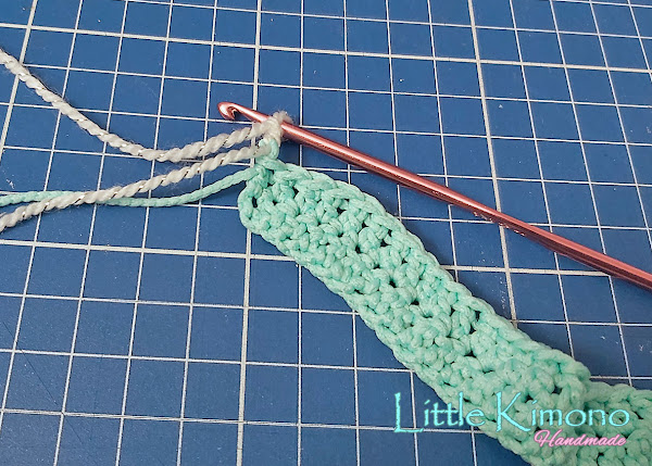 Cuando tengamos la cadeneta hecha metemos en el último punto un marcador y levantamos 3 puntos, pasamos por el agujero del marcador y hacemos puntos altos hasta el final.