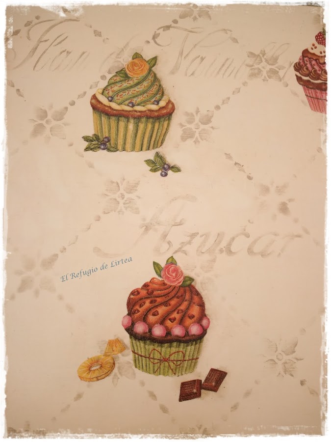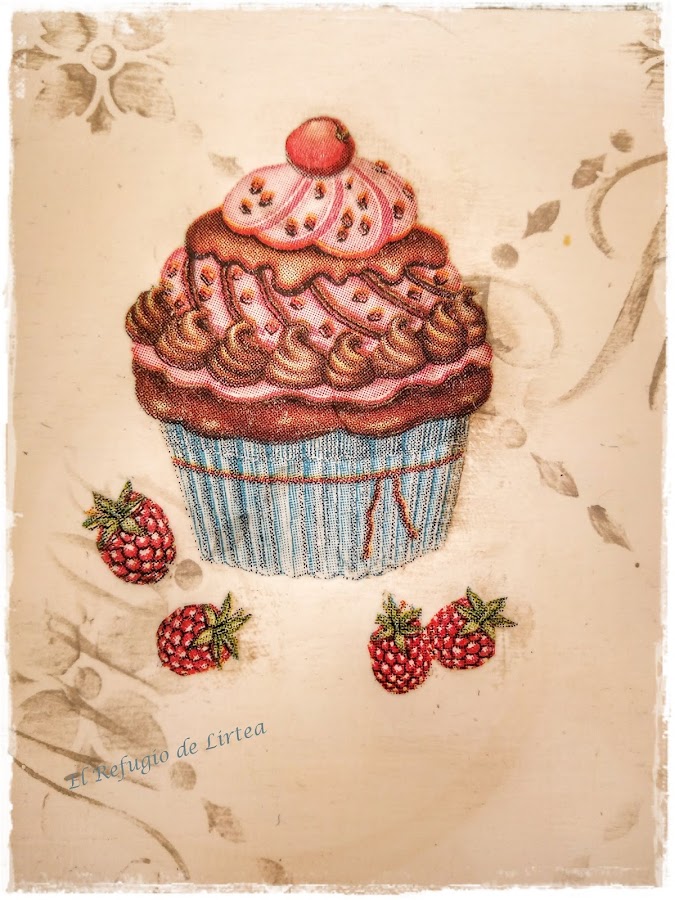 Una vez todos pegados, volví a dar otra capa de barniz y cuando estuvo bien seco hice un sombreado con pátina que hice con un poco de oleo en color siena mezclado con cera incolora.Así consigo que las imágenes se integren mejor sobre el fondo.