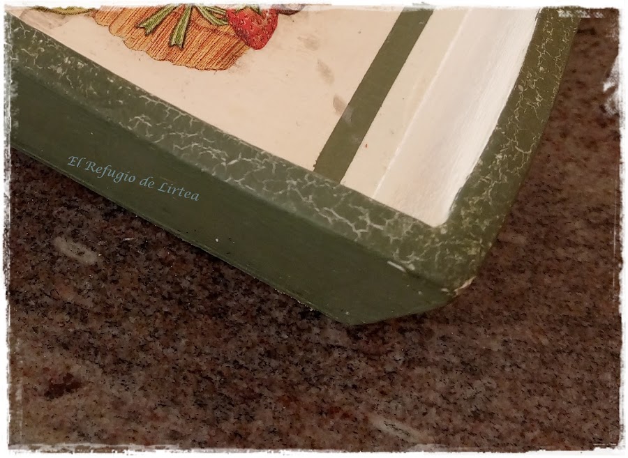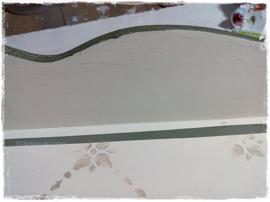 Como sabéis que me gusta combinar técnicas, hice un craquelado en todo el borde.Primero pinte con el color encaje, luego puse craquelador de un paso ( una fina capa, porque quiero las grietas pequeñas) y cuando este secó apliqué con esponja el color verde intentando no pasar dos veces por el mismo lugar para no arrastrar el craquelador. Las grietas salen casi instantáneamente y dejan ver el color claro de base.