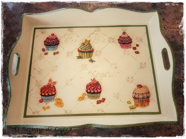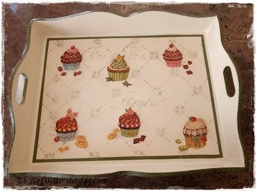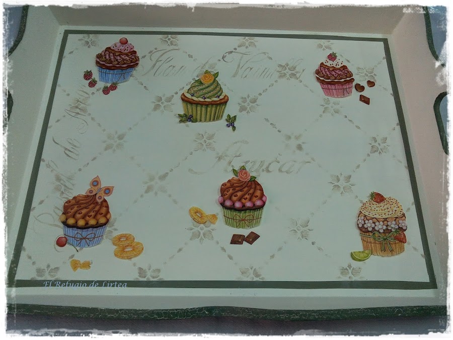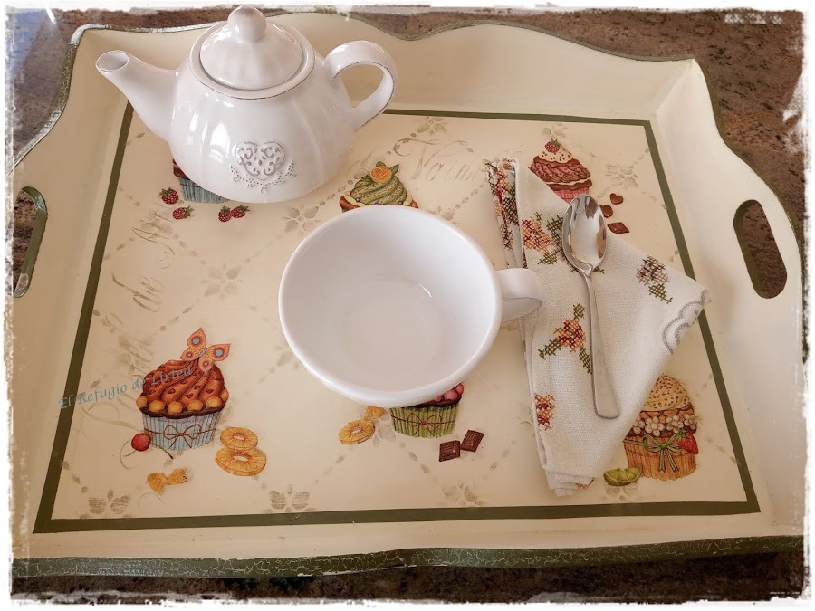 El decoupage lo hice recortando con tijeras imágenes de una servilleta. No lo hice con los dedos, porque el fondo de la servilleta no era del mismo color que el fondo de mi bandeja.