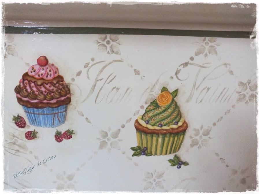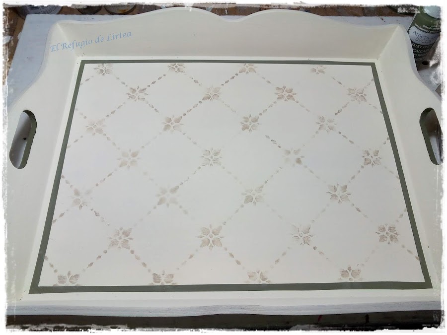En el fondo de la bandeja hice dos stencil con plantilla. Uno como fondo y luego puse unas palabras y frases muy "dulces" como azúcar, miel, flan de vainilla.
