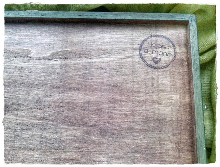 En la parte inferior, con pintura acrílica color marrón, hice una aguada es decir, mezclar la pintura con agua en proporción una parte de pintura por dos de agua y estampé un sello, "Hecho a mano"