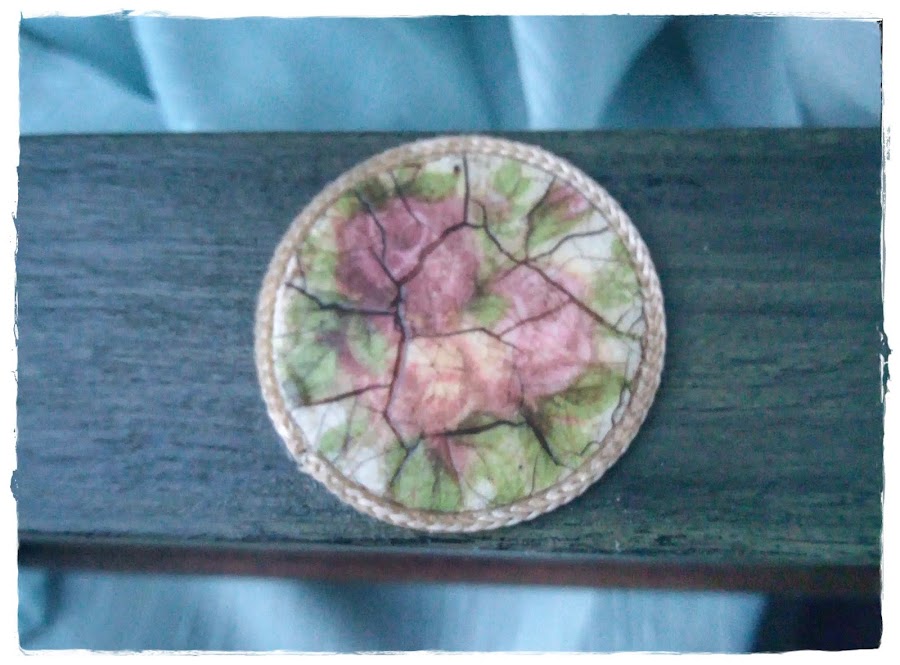 Como elemento decorativo, puse en el frente una plaquita también adornada con la misma servilleta, le hice un craquelado y rodee con un cordoncillo dorado.