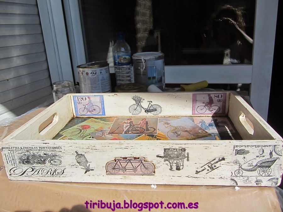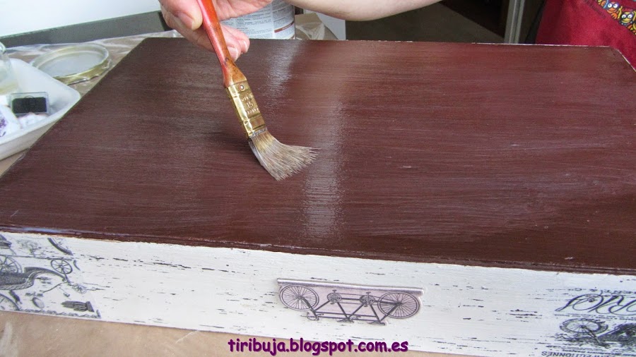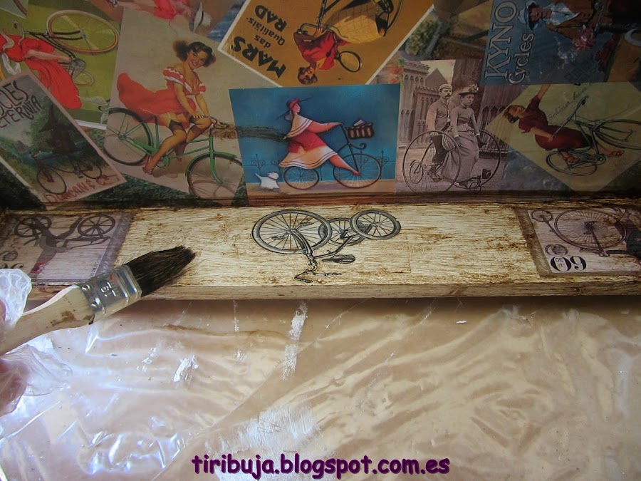 En los laterales largos hay transfer, decoupage y sellos con imágenes de bicicletas.Con la cuchara apretamos para que el transfer se adhiera bien a la madera. Una vez seco humedecemos el transfer y quitamos los restos de papel...