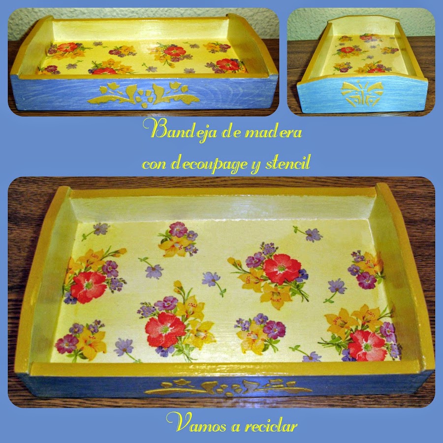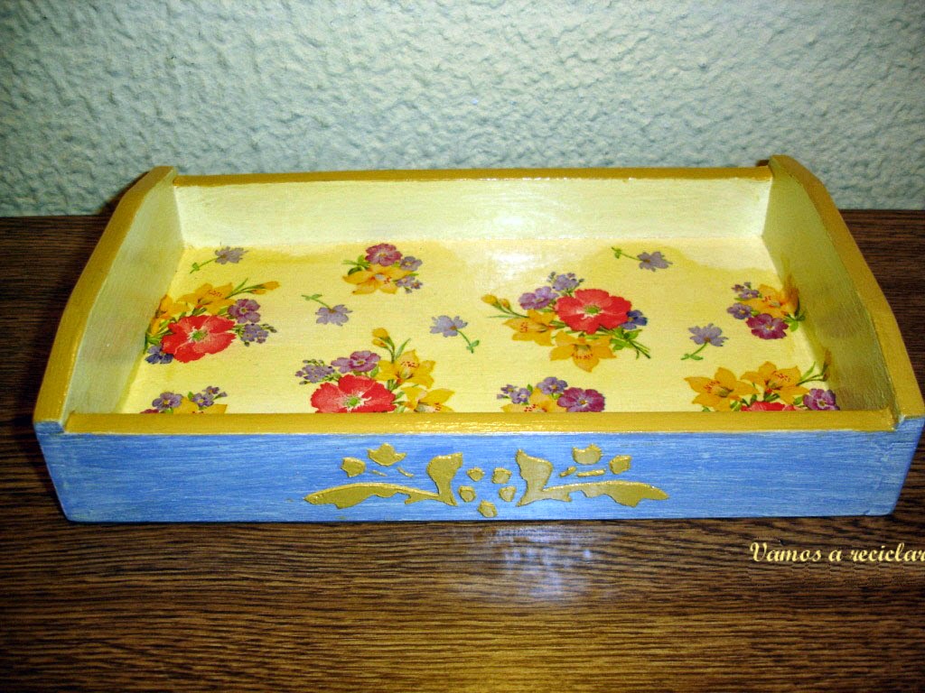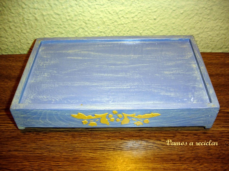 Con plantillas hechas con acetato de radiografías hice en los lados de la bandeja unos stencils con pasta de relieve teñida con un poco de pintura ocre.