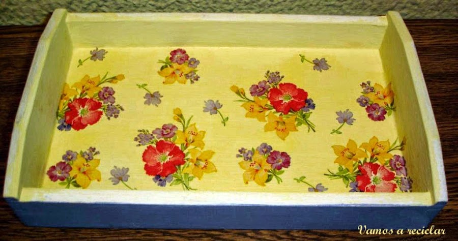 Eché cola en la parte interior de la bandeja y pegué la servilleta de flores intentando no dejar arrugas.