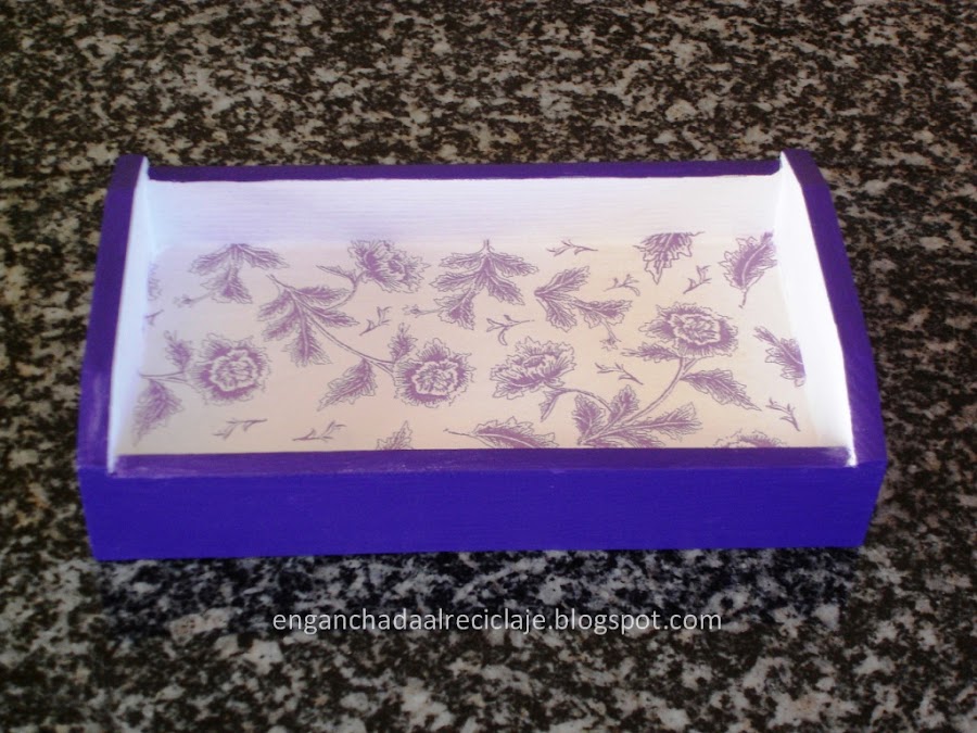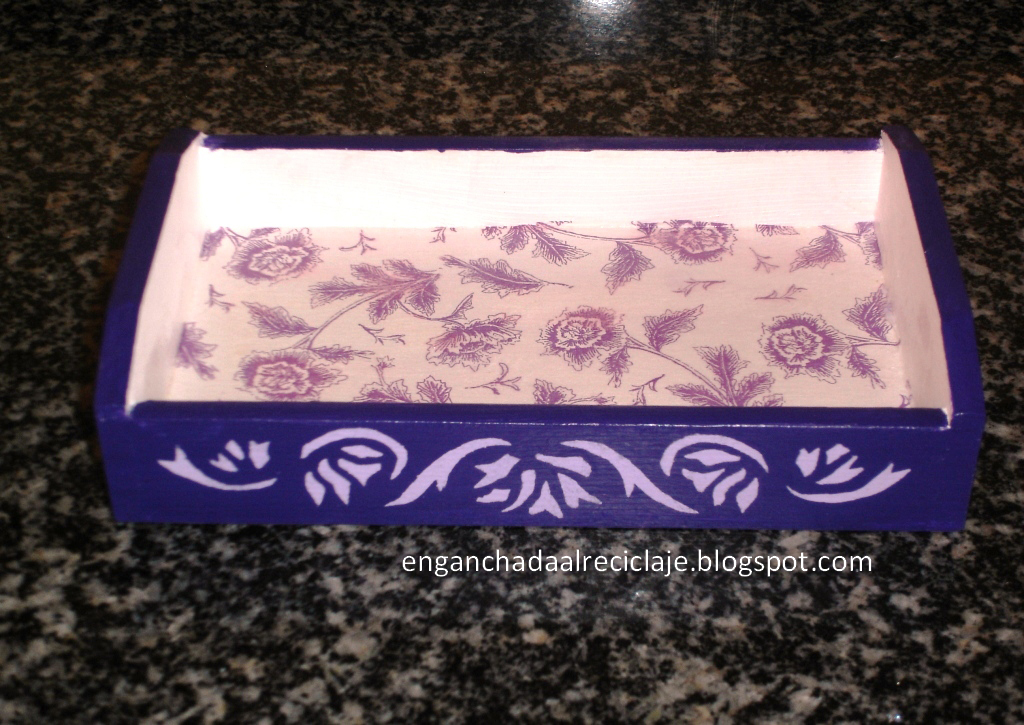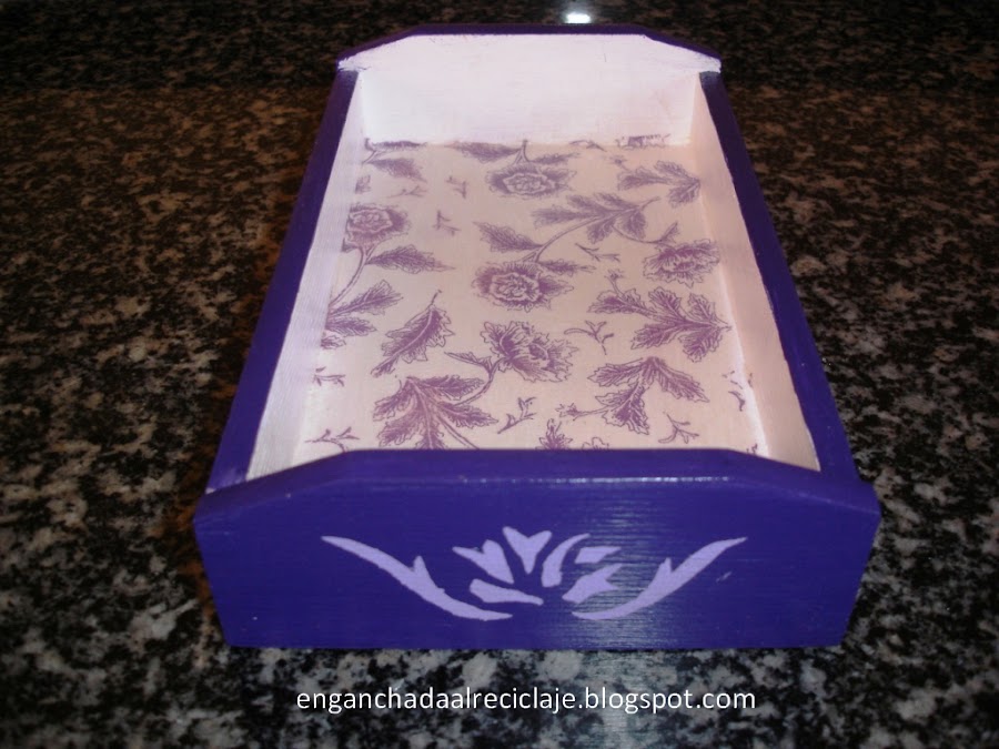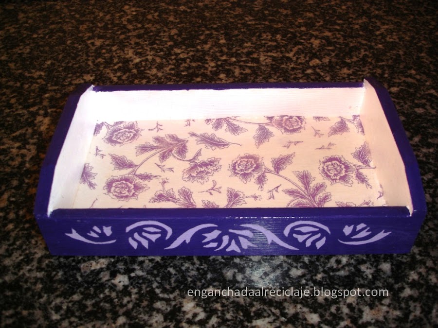 Hice una plantilla con acetato y le puse unos stencil por la parte de afuera. Cuando secó bien, un lijado suave y para terminar dos manos de látex un poco aguado por toda la bandeja.