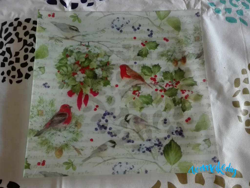 Bandeja de cristalPapeles navideños de decoupage (yo he utilizado Tissue Paper de Caspari)