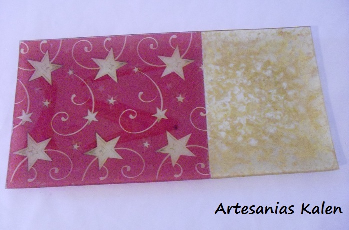 de cerca el decoupage con servilleta aplicada por detrás del plato con laca vitral fosco (opaca)
