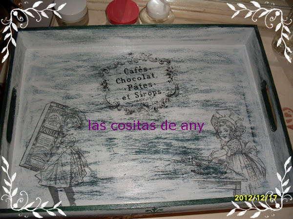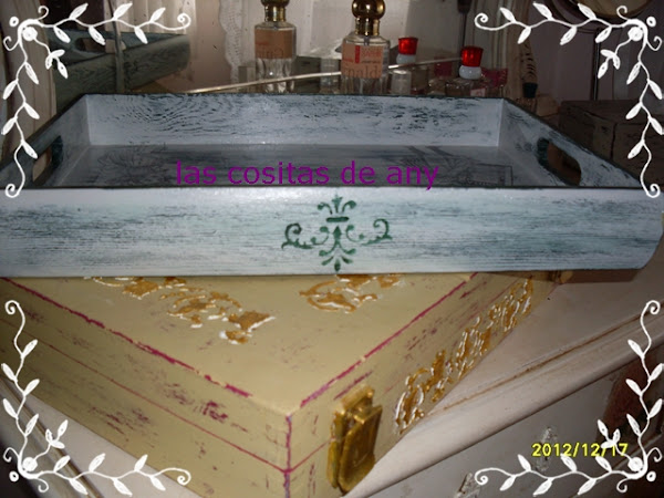 y una bandeja,lleva acuaplas en el fondo para marcarle unas rayas,decoupage y envejecida y craquelada por algunas partes,y la tecnica de la vela