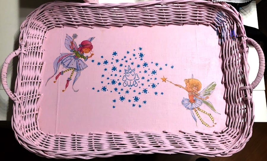 Luego la pinté con pintura a la tiza rosa, le hice un motivo de stencil de un unicornio con estrellitas en el centro con pintura a la tiza turquesa y puse con decoupage un par de hadas, una en cada lado, y el resultado es este: