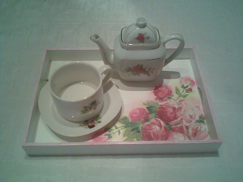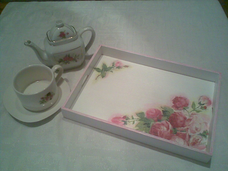Buenas!habéis aprovechado el finde para dedicaros a vuestros trabajos?yo la verdad es que no he podido...así que hoy me he puesto con esta bandeja que tenía en mis "tareas pendientes"...aquí os la dejo, recién salida del horno...! Un toque shabby y la lámina de cupcakes vintage y...este es el resultado! Para llevar el té...o ...