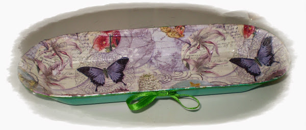 La limpiamos bien( nos comemos antes el contenido, (si es que no estamos a dieta)y comenzamos a adornarla, en mi caso con servilleta, pintura acrílica para el exterior y una cinta o lazo.