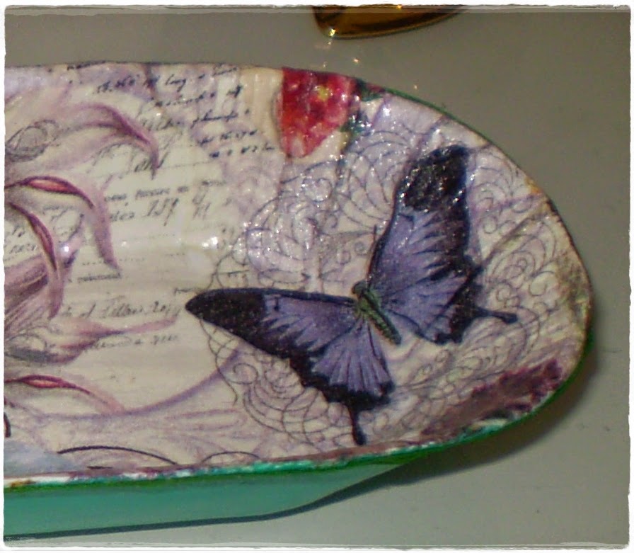 Una vez pegada la servilleta y como la voy a utilizar para poner mis bolígrafos o las gafas( que siempre las tengo perdidas por casa) le di dos manos de la misma cola blanca por encima de toda la servilleta, dejando secar entre capa y capa para protegerla.