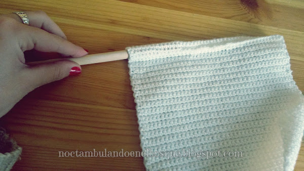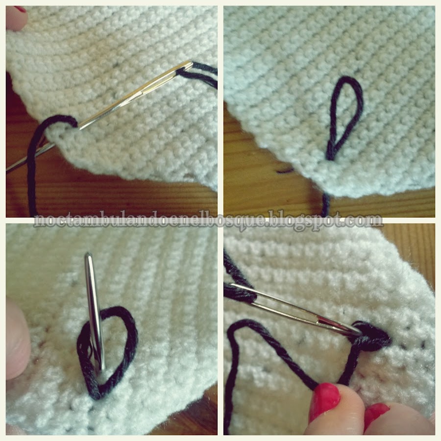 - Y en esa fila iremos haciendo puntos deslizados cogiendo el punto entero y uniendo el extremo del tejido. Aquí también podéis optar por coser si lo véis más fácil.