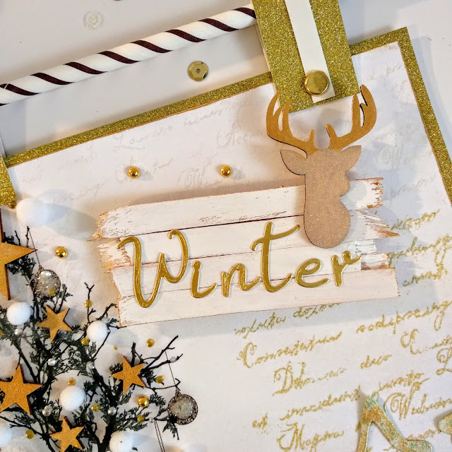 Con él paticipo en el reto de diciembre de Locas por el Scrap en el que pedían, además del tema navideño, utilizar embossing en caliente, es decir, polvos de embossar y pistola de calor. En este proyecto he usado esta técnica para el fondo, esta y otras, hasta crear la base que quería.