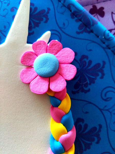 Lo ultimo que nos falta por recortar es la flor en goma eva. Le daremos un poco de forma con calor y pegaremos al comienzo de la trenza del unicornio.