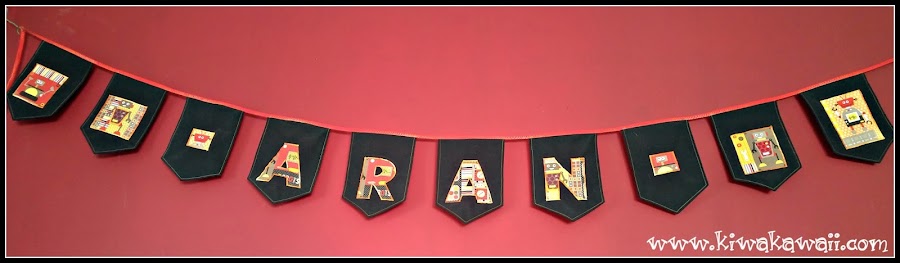 La forma es distinta al triángulo habitual, además de ser bastante grandes y en cada banderín hay una aplicación de robots; los centrales son su nombre. Lleva su trabajo pero merece la pena porque el resultado es muy chulo.