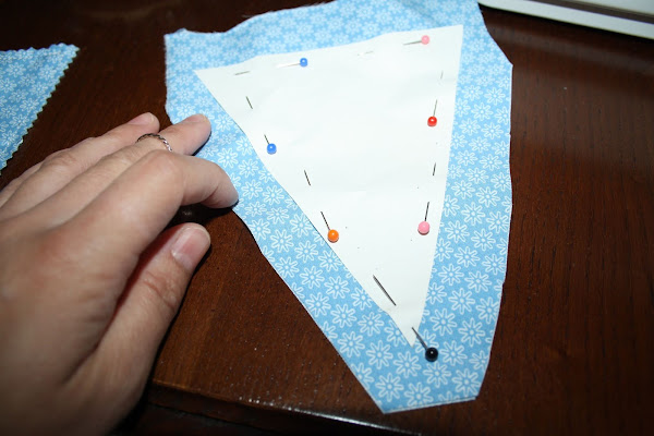 Es tan fácil que casi no necesita explicación. Escoges las telas que quieres usar y después de recortar en papel una plantilla de un triángulo lo pasas a la tela.