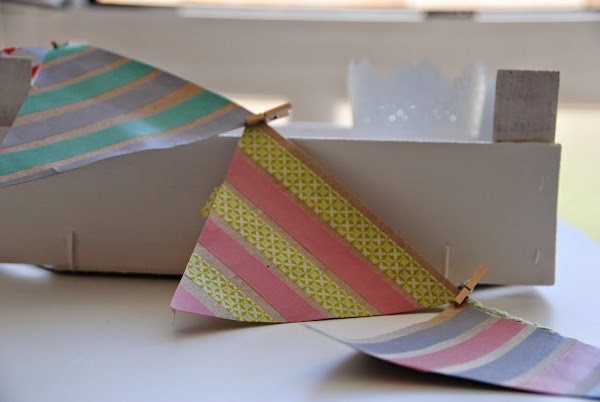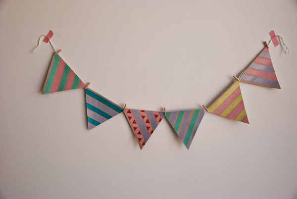 Empezamos la semana y ya vuelvo por aquí, después de bastantes días sin tiempo para poder publicar nada. Hoy os enseño estos banderines hechos con dos de los materiales más adictivos en el mundo del DIY: papel kraft y washi tape. Solamente tenemos que hacer triángulos del tamaño que queramos en un par de folios de papel kraft, recortar y decorar con washi tape de la manera que más nos guste. Para colgar los banderines he utilizado pinzas pequeñas, y como soporte, un poco de mi Baker"s Twine casero y que os enseñé como hacer en el anterior post. Son ideales para decorar en una fiesta o para dar un poco de alegría a nuestro estudio.
