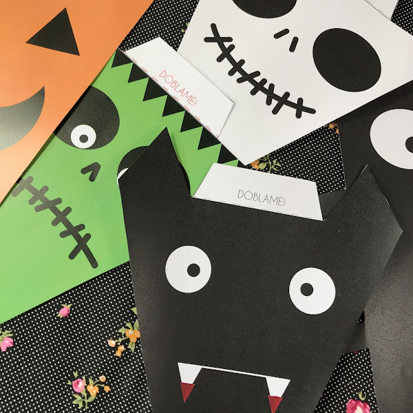 Yo imprimí solo la calabaza y el Franky en color, el resto en blanco y negro. Los colmillos del vampiro están pintados con rotulador rojo (hay que ahorrar amigos).