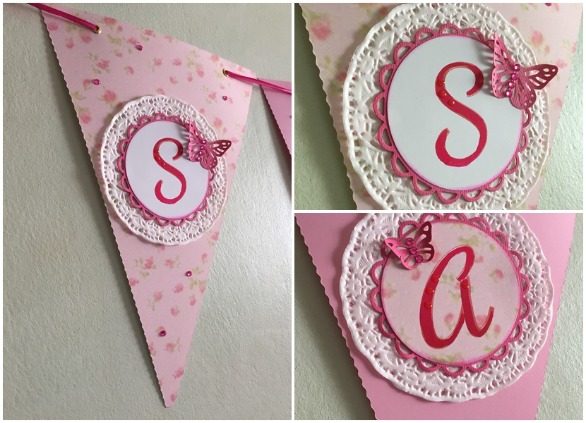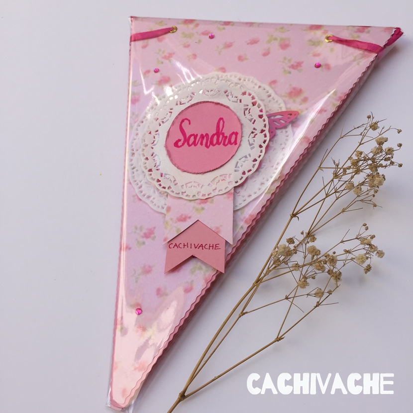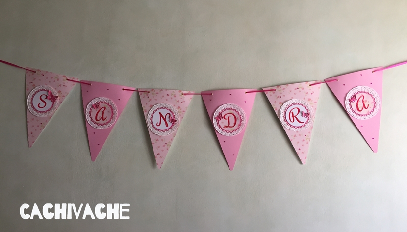 Una Banderola de fiesta con flores, mariposas, blondas, brillantes y en color rosa que tanto le gusta a Sandra!!!