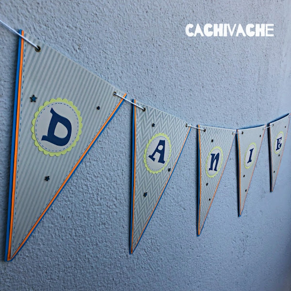 Con apliques en madera teñida de azul y su nombre con una superposición de papeles y colores...