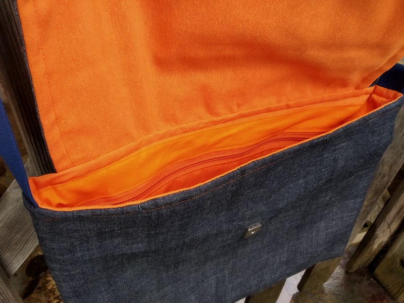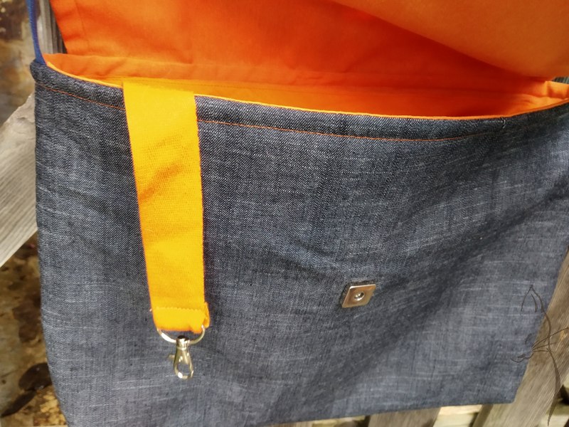 La tela principal es tejano con un efecto ligeramente desgastado muy chulo, combinado con loneta naranja. Con una capa de entretela de bolso para dar cuerpo.