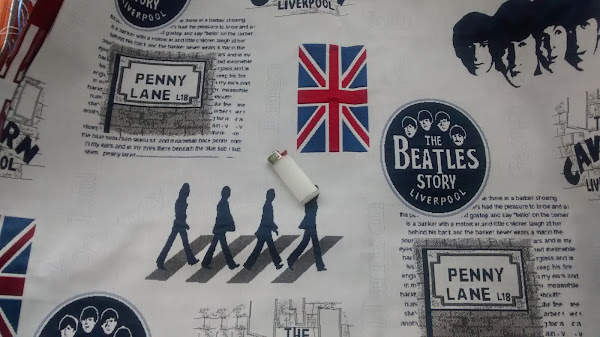 Es una loneta labrada de color crudo y estampados en azul marino y granate, tiene los dibujos bastante grandes lo que me hace que no sea muy apropiada para proyectos pequeños como éste (ahí podeis ver el mechero como referencia del tamaño). La encontré en El Revoltijo el invierno pasado.