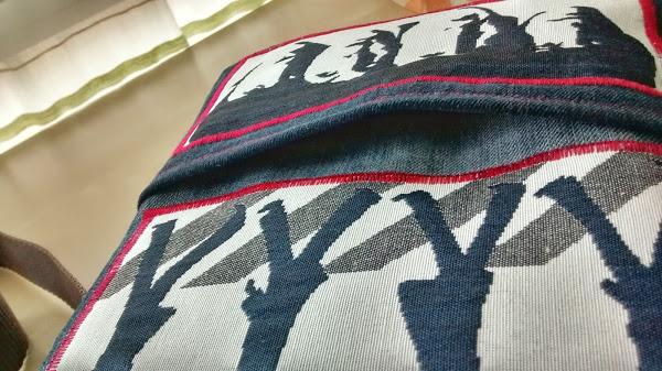 Decidí usar sólo algunos de los dibujos y añadirlos a una tela base, pespunteándolos a su alrededor con hilo rojo para darle algo de color... y ¿qué tela elegí? ya que necesitaba algo práctico, firme y resistente me decanté por aprovechar vaqueros viejos de diferentes tonos (ya sabéis que acaparo pantalones viejos de todo mi entorno para usarlos en mis costuras).