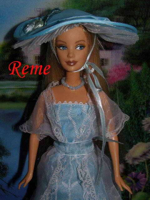 Éste es uno de los vestidos que utiliza en la peli, compuesto de: pamela con un detalle floral, el vestido (hecho de varias capas) muy vaporoso y con cola y un fajín para su cinturita.
