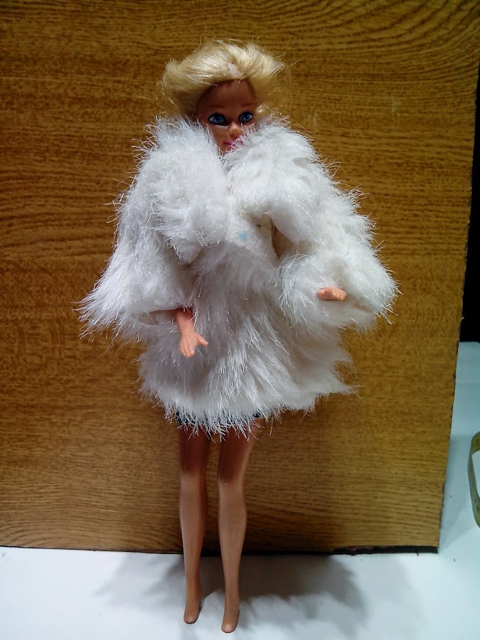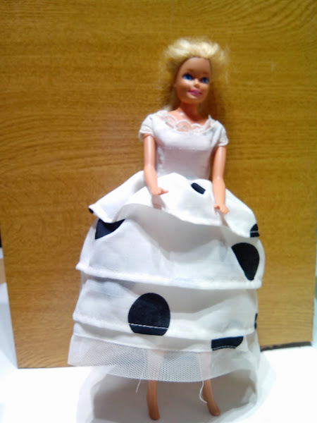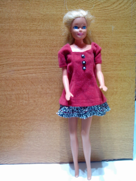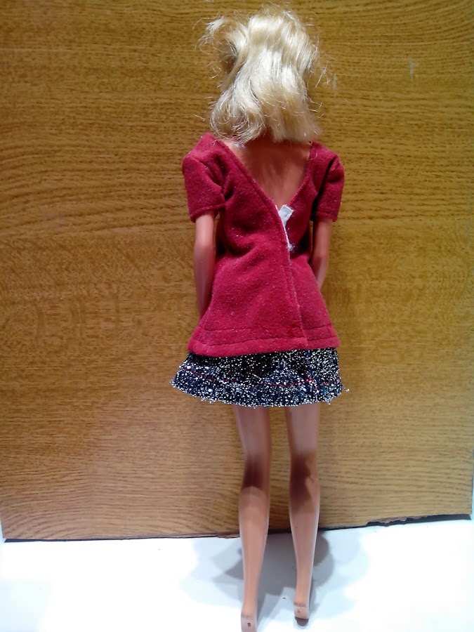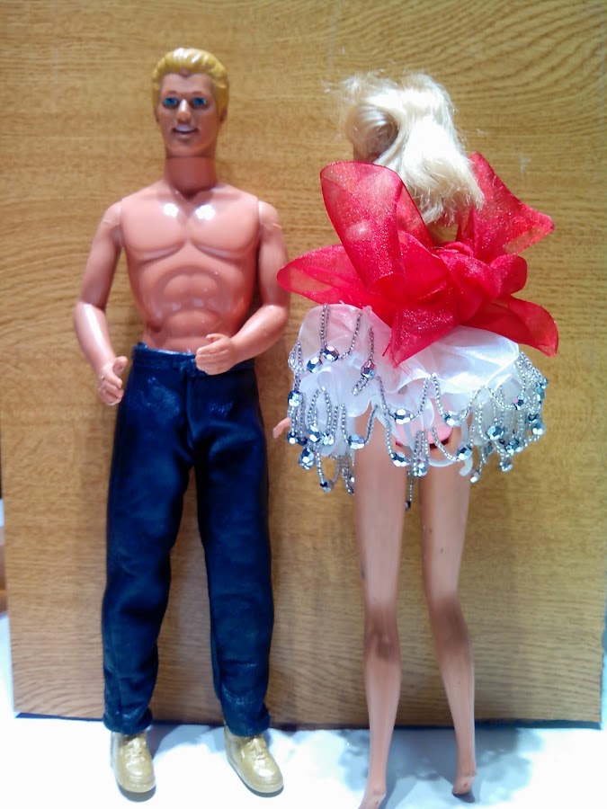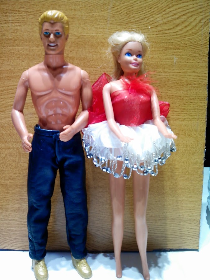 Aqui comienzo con este conjunto de fiesta, realizado con cinta de organza y cadena de bisuteria, falda en blanco y top rojo. Le acompaña Ken con pantalón realizado en piel ovina.
