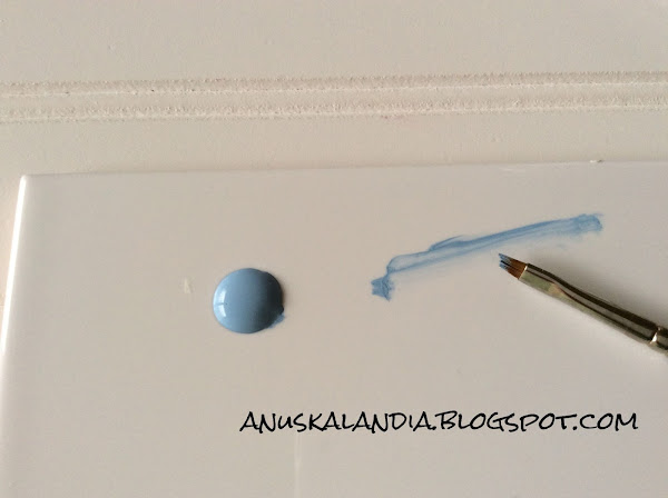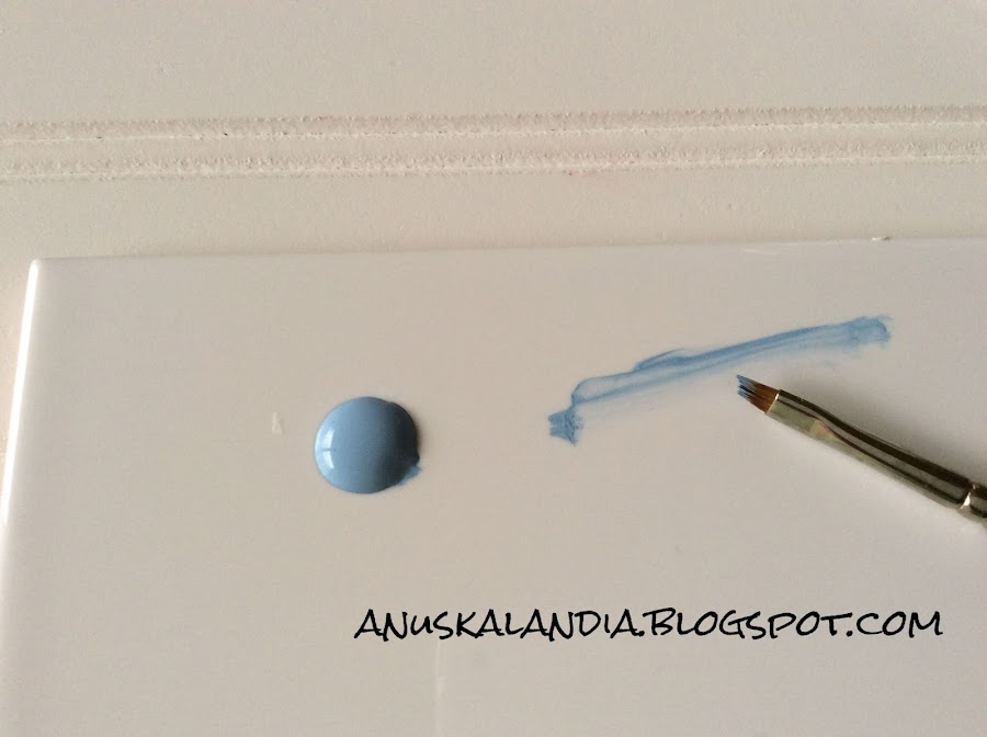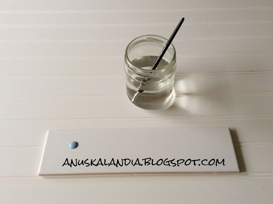 - Primero ponemos una gota de pintura en una superficie. Yo utilizo un rodapie. Aparte, humectamos el pincel en agua. Es conveniente tenerle un rato antes sumergido, si queremos que nuestros pinceles tengan una larga vida.