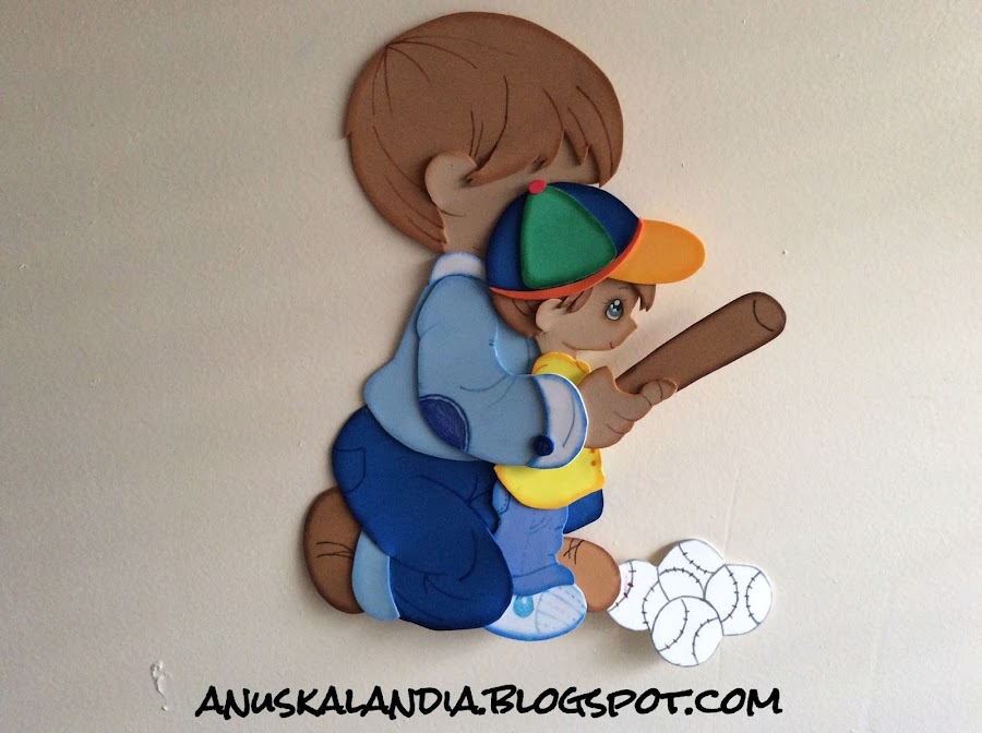 Montamos todas las piezas, pegamos y aquí tenemos el resultado final. Un papá, enseñando a su hijo a jugar al béisbol. El trabajo terminado tiene unas medidas de 32 cm. de alto por 26 cm. de ancho, en su parte más ancha.