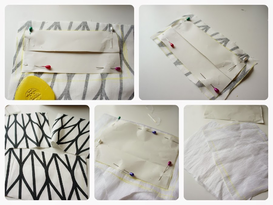 Con un cuarto de folio como patrón cortamos 2 trozos de tela y 2 trozos de forro. Para hacerle un bolsillo lateral cortamos tela con medida de 2/3 del total del patrón original.