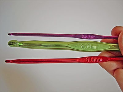 Las agujas tienen diferentes grosores en función del hilo o de la lana que vayamos a utilizar. Cuanto más fino sea el hilo, más fina tendrá que ser la aguja. El grosor viene indicado en cada aguja. En la imagen de arriba, la aguja morada es de 2,50 mm, y se utiliza con hilos finos para tejer puntillas o labores con el punto muy pequeño (ropita de bebé, por ejemplo). La aguja roja es de 3,50 mm, y es el grosor típico que se utiliza para hacer amigurumis. Finalmente, la aguja verde es de 6,50 mm, y la podremos utilizar para tejer bufandas gruesas, gorros, alfombras de trapillo, etc.