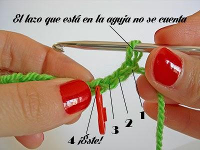 En primer lugar, tendrás que localizar el cuarto punto de vuestra cadeneta. Para ello, cuenta cuatro lazadas sin tener en cuenta la que está en la aguja.