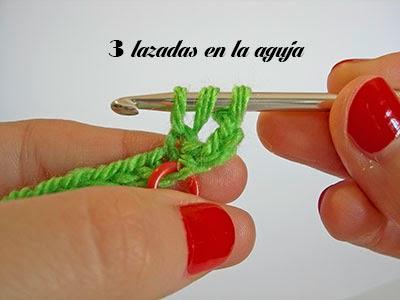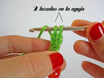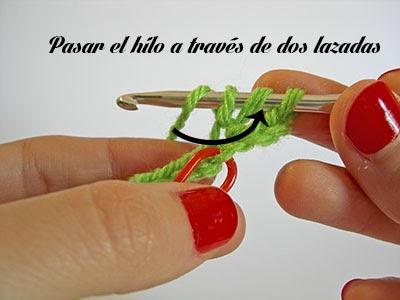 Ahora tendrás tres lazadas en la aguja. Echa hebra de nuevo y sácala a través de las dos primeras lazadas que hay en la aguja.