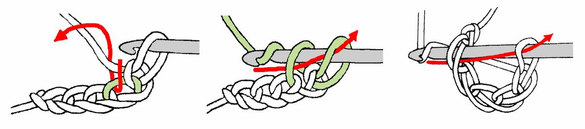 Las dos primeras imágenes corresponden a un punto raso hecho para mover el hilo a través de otros puntos, y la tercera corresponde a la unión de una vuelta en redondo.