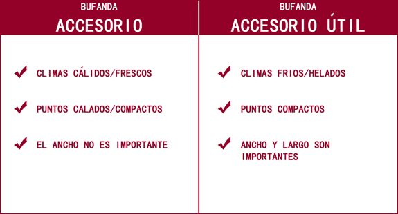 "Mientras que el fin de una bufanda accesorio no es el de protegernos contra las inclemencias del tiempo pues está pensada para climas cálidos o templados, por sus características, una bufanda como accesorio útil nos protegerá de inviernos frios o helados".